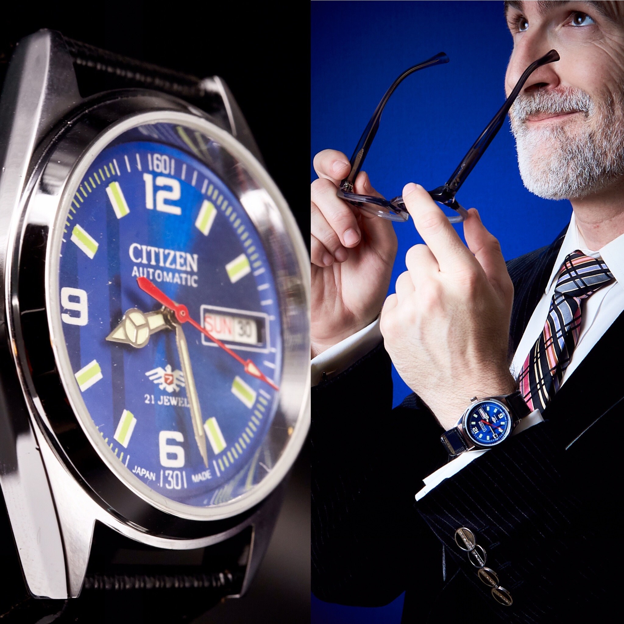 This heavily modified example 1960s-era Citizen watch is one of my FAVORITE watches ever. I like it more than every Rolex I've ever had, no joke. It's just perfect, classic, sturdy, and not too pricey. (That's why I bought it!) It's reassuringly heavy and just big enough to be classy but not ostentatious. (For example, it's the exact same size /weight as a late 1980s Rolex Datejust with the sapphire crystal.) I work with an artist in India named Mr. X that makes these special custom modded Citizen watches FOR ME ONLY. You won't find them anywhere else!